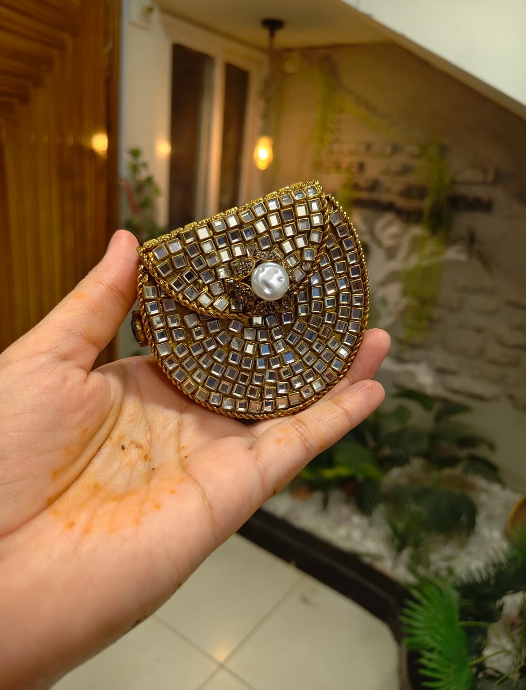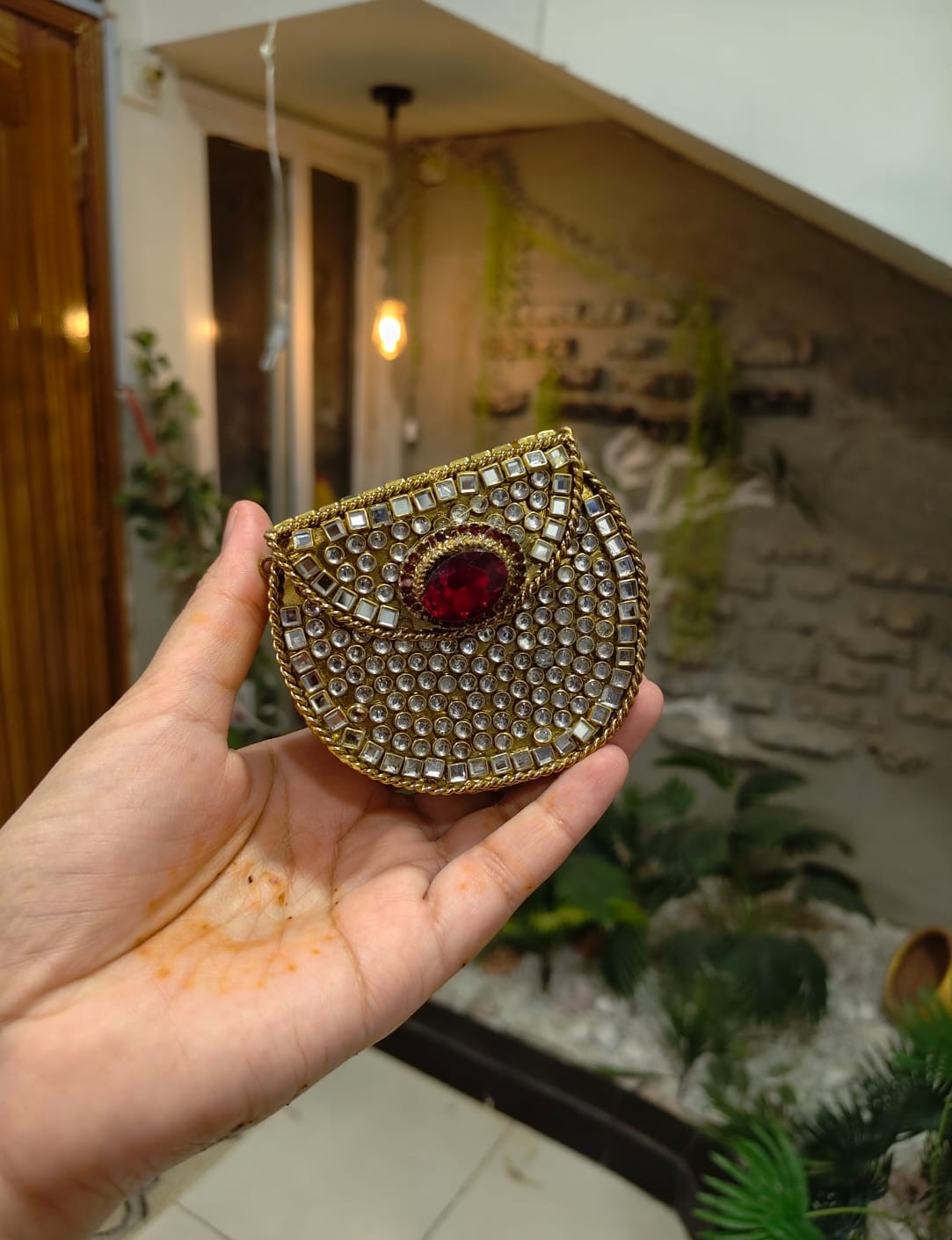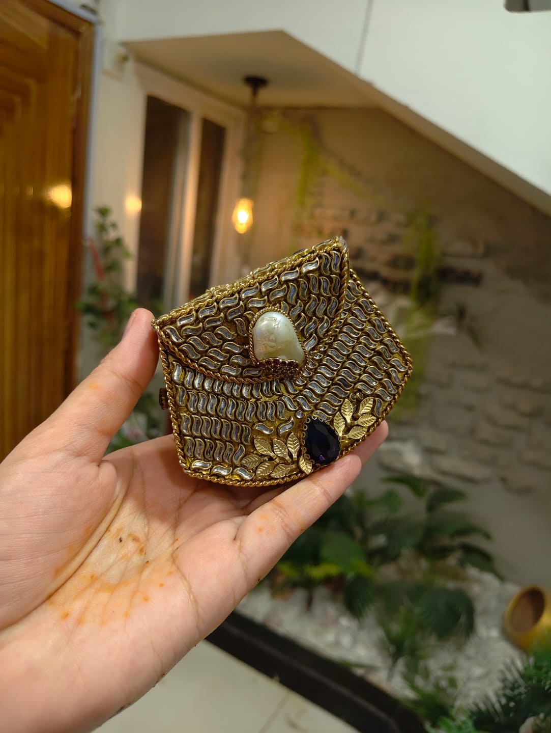 This stunning mini clutch features intricate handwork, premium stones, pearl detailing, and a bold center gem that gives it a royal touch. Compact yet eye-catching – ideal for bridesmaids, wedding guests, and festive wear.