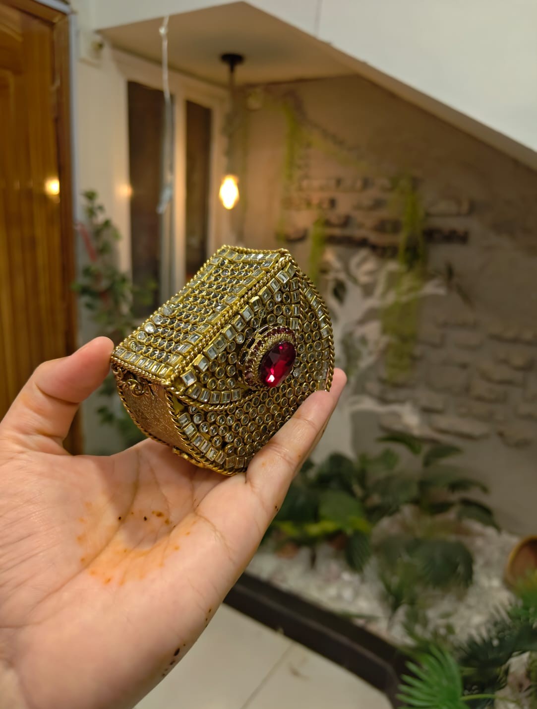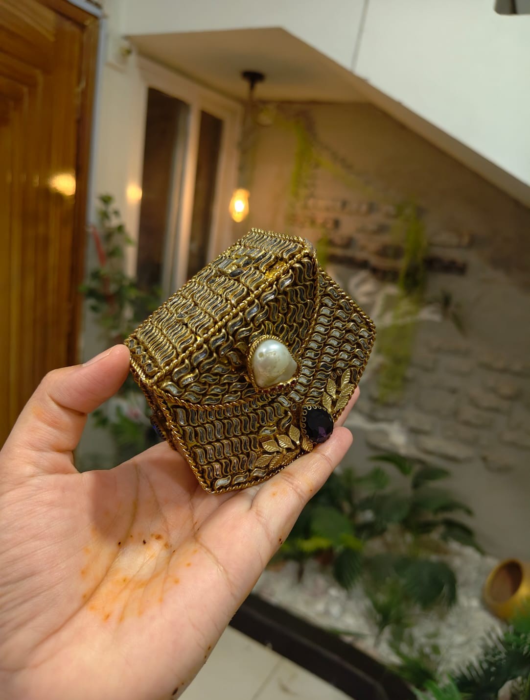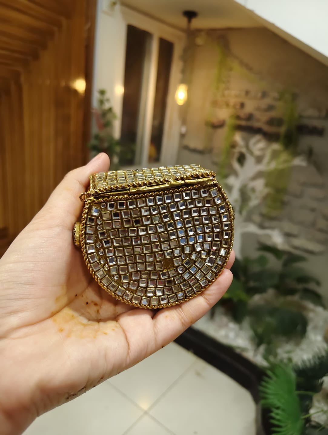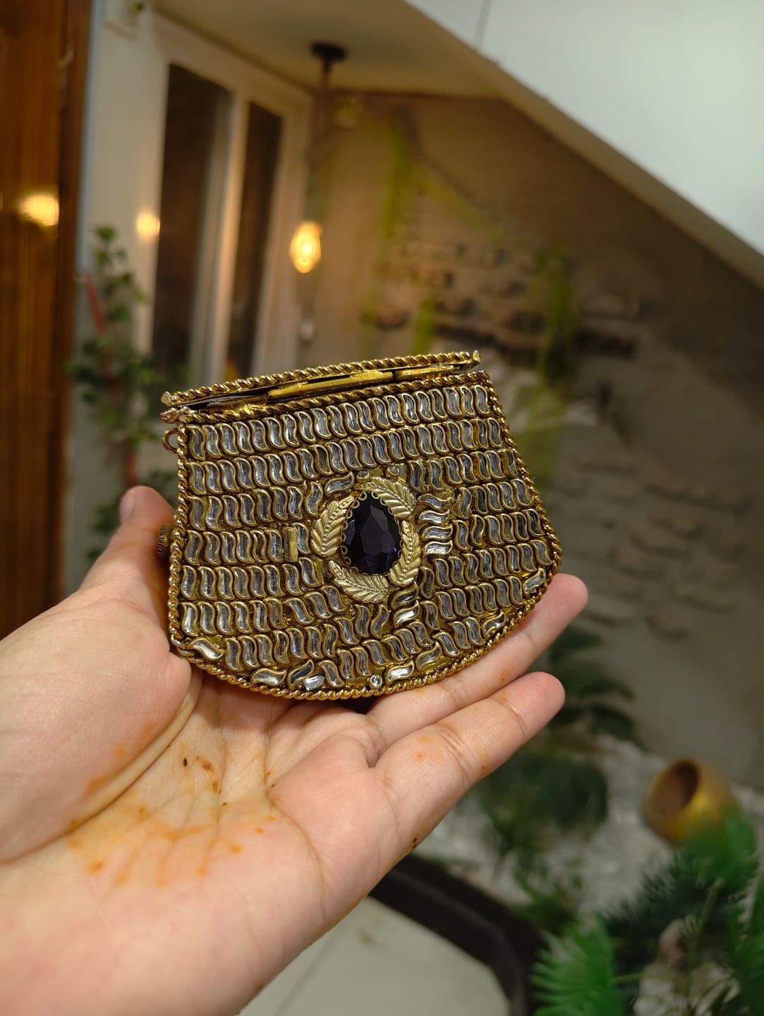 This stunning mini clutch features intricate handwork, premium stones, pearl detailing, and a bold center gem that gives it a royal touch. Compact yet eye-catching – ideal for bridesmaids, wedding guests, and festive wear.