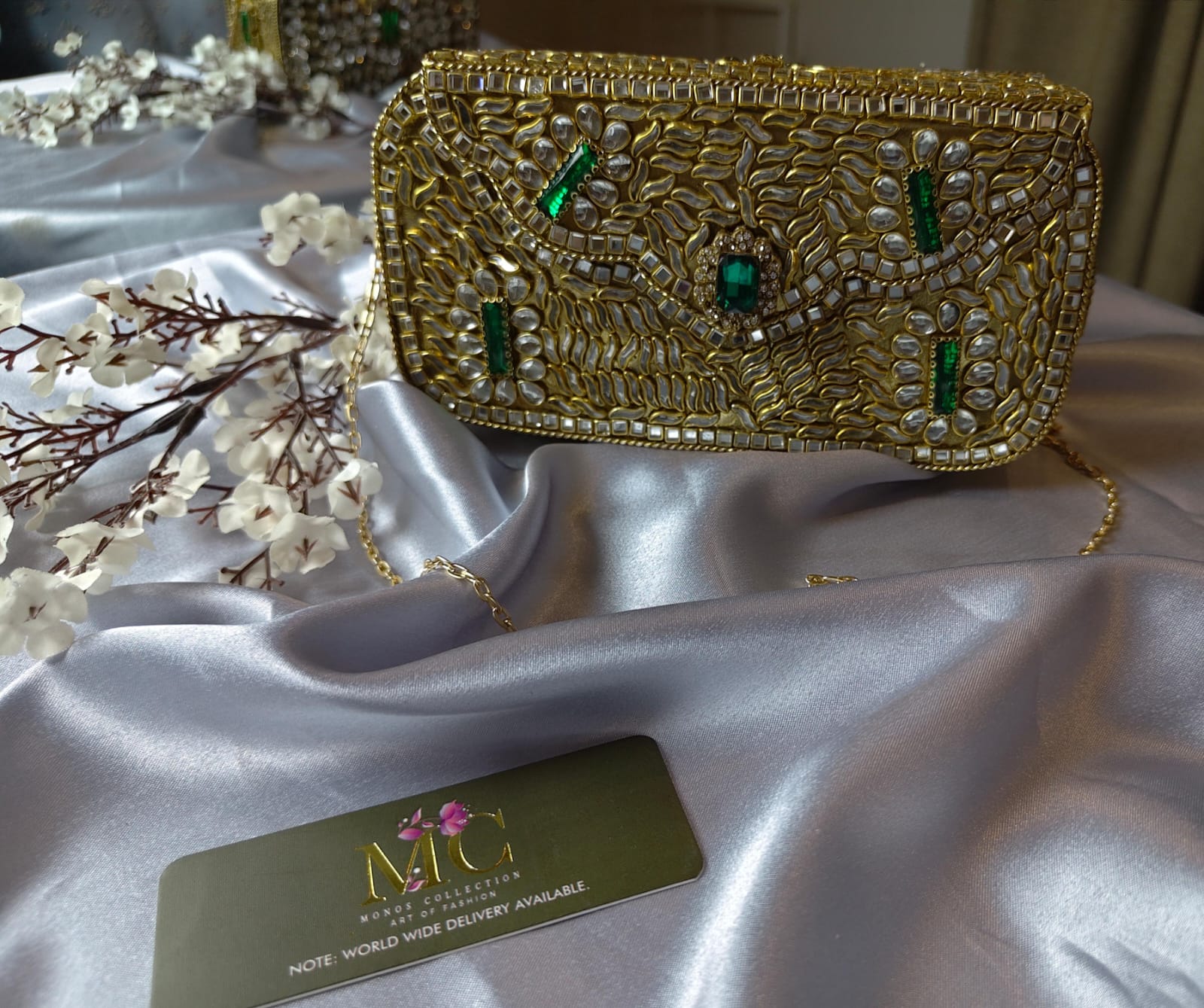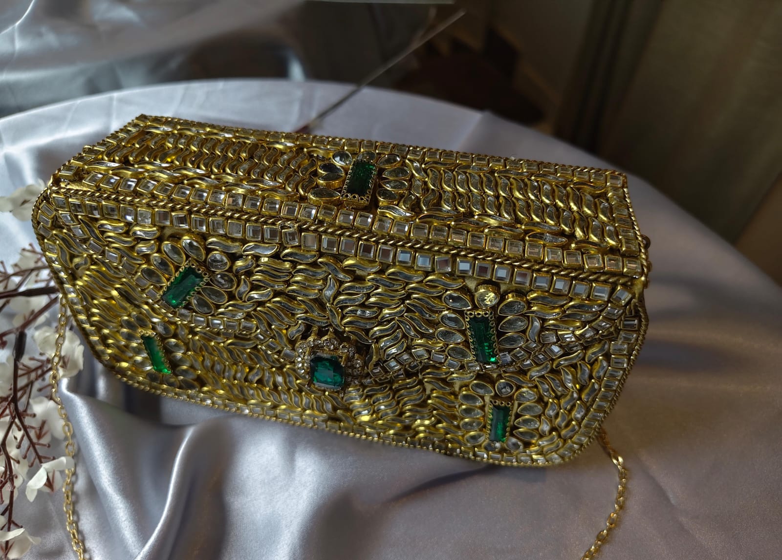 “A stunning big-size Kundan clutch adorned with intricate stonework, offering a perfect blend of elegance and spacious convenience. Ideal for weddings and festive events, this statement accessory adds a royal touch to any outfit.”