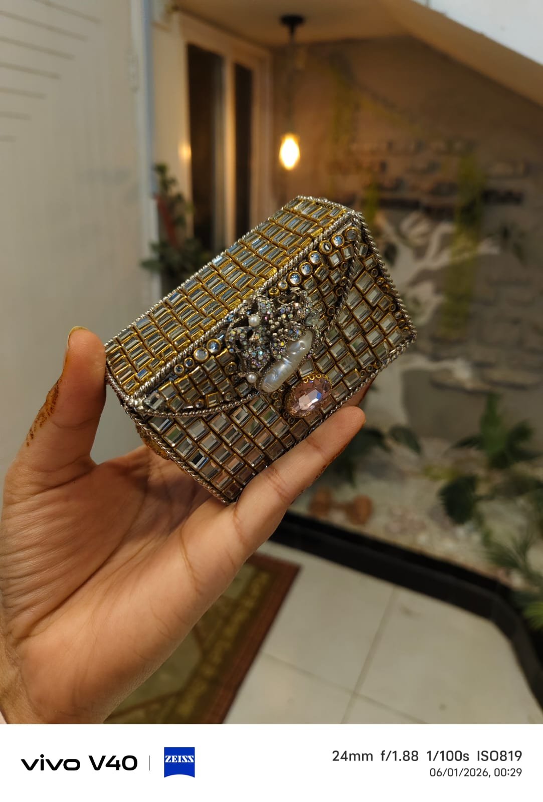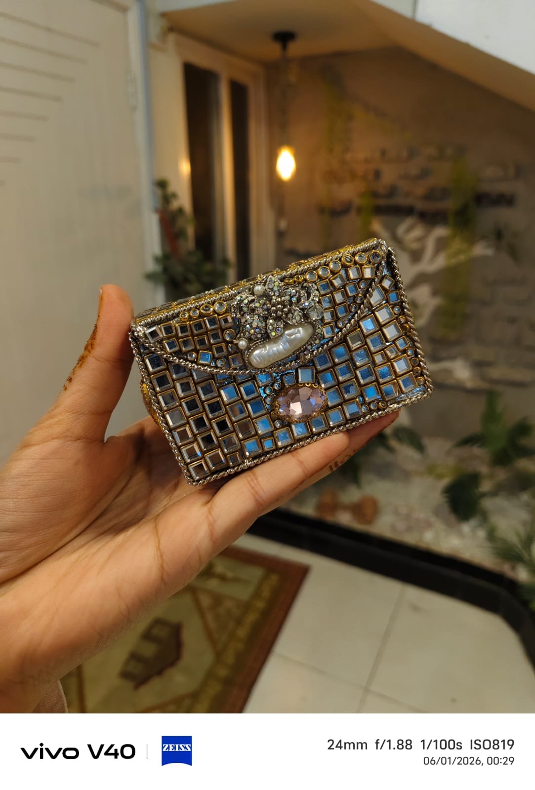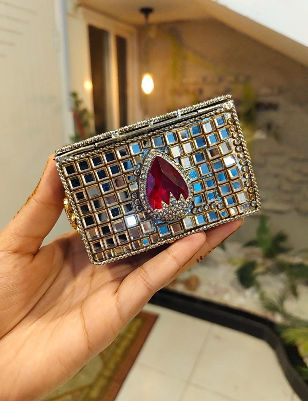 A stunning handcrafted clutch adorned with mirror tiles and a bold ruby-red centerpiece, designed to add instant glamour to any festive or evening look.