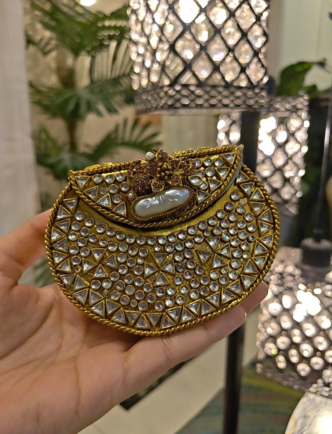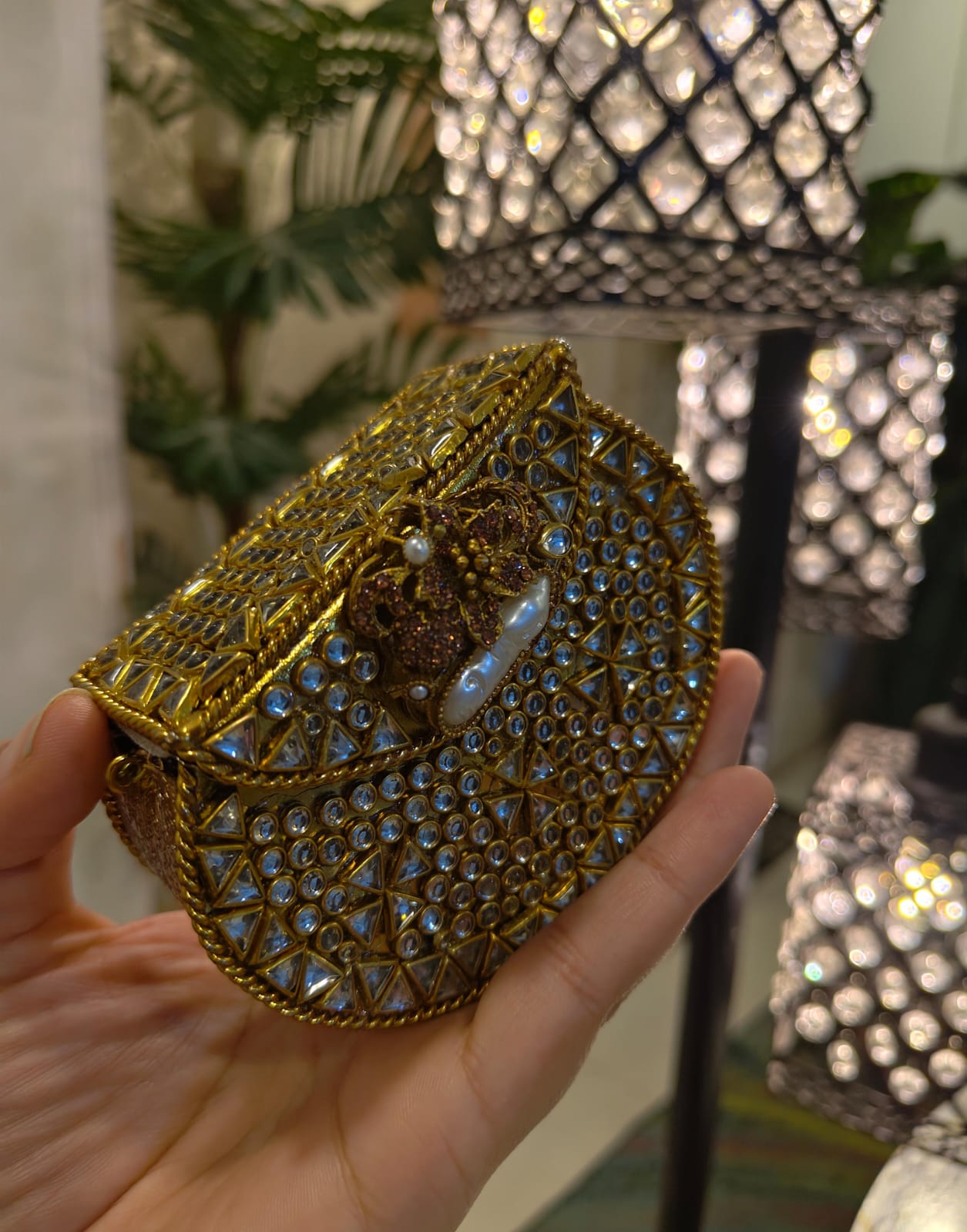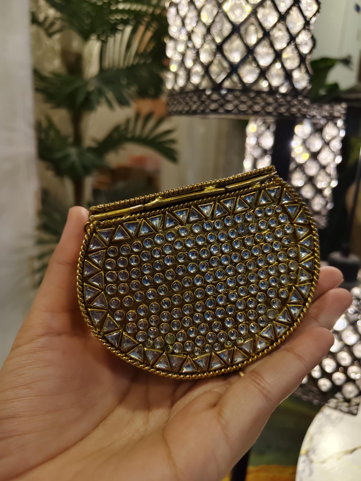Mini clutch beautifully handcrafted in pure Kundan work—delicate, elegant, and perfect for adding a traditional royal touch to any look.”