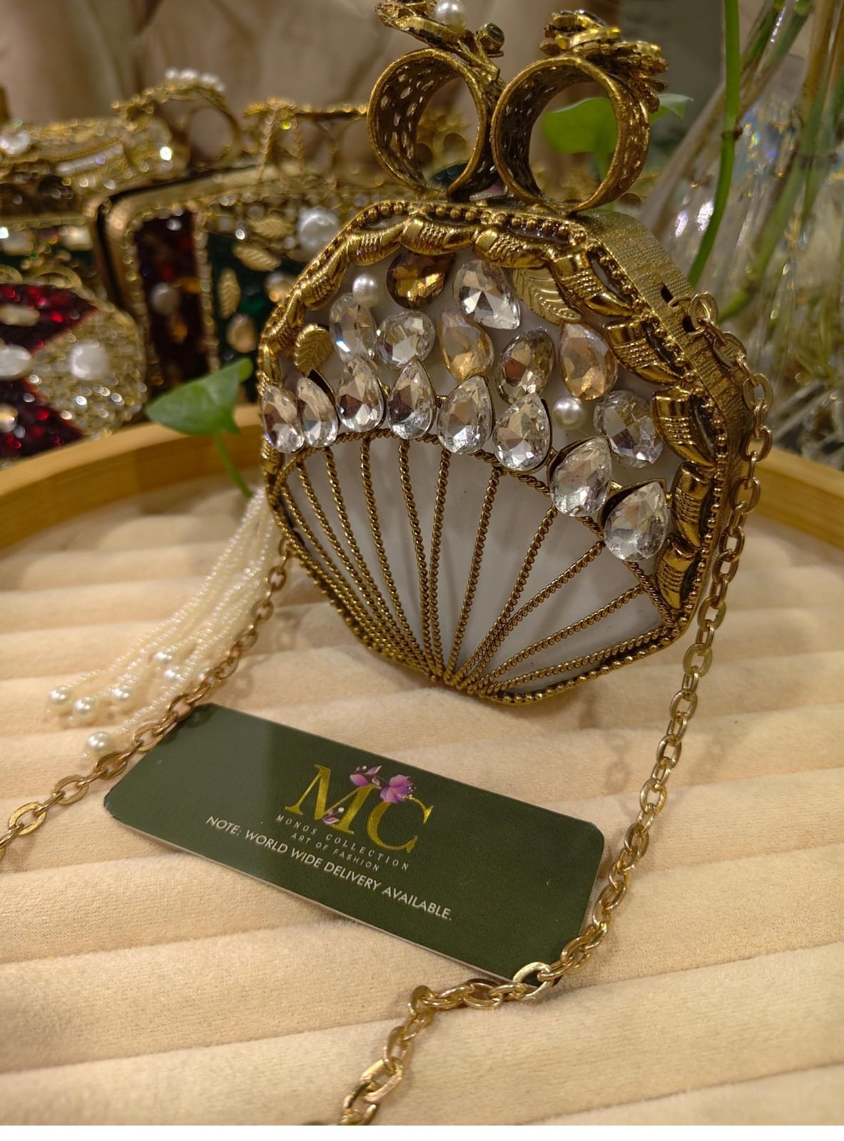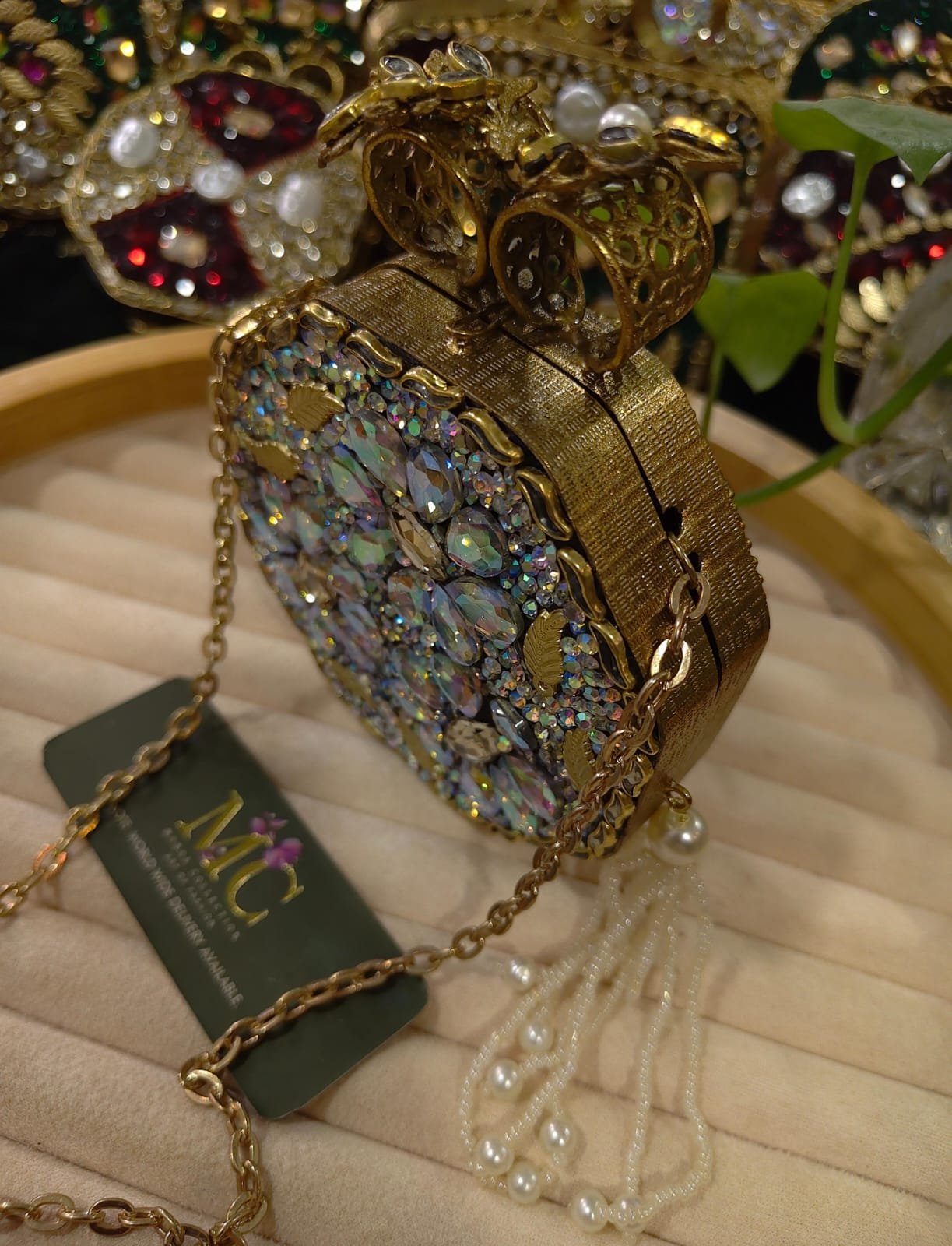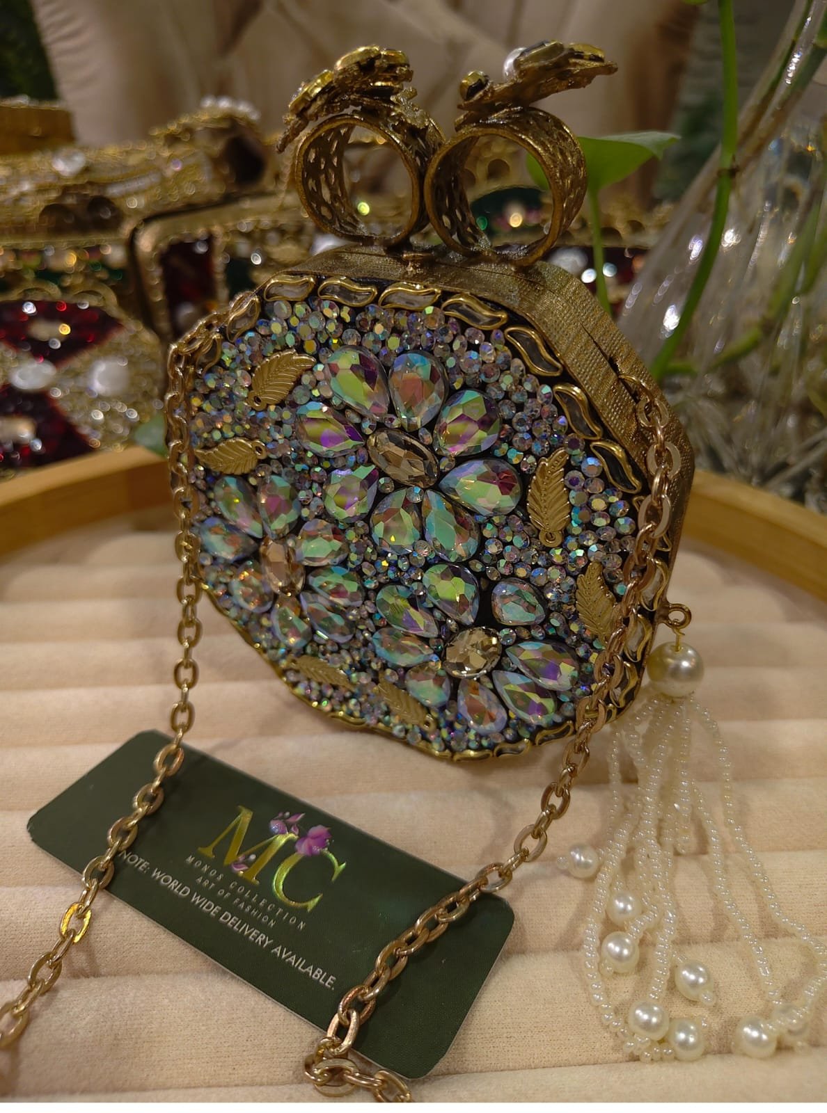 A glamorous evening clutch adorned with sparkling Swarovski crystals and intricate kundan-style stone detailing, perfect for weddings, parties, and formal occasions. Its compact, handcrafted design combines traditional elegance with modern luxe shine, elevating any outfit with radiant sparkle and refined charm.