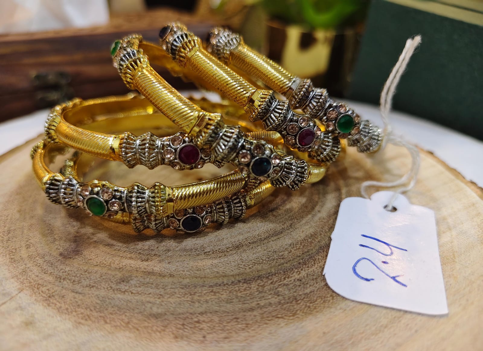 โElegant antique-style bangles from the Monos Collection, featuring gold-tone detailing, silver carving, and vibrant multi-color stonesโperfect for adding timeless charm to any outfit.โ